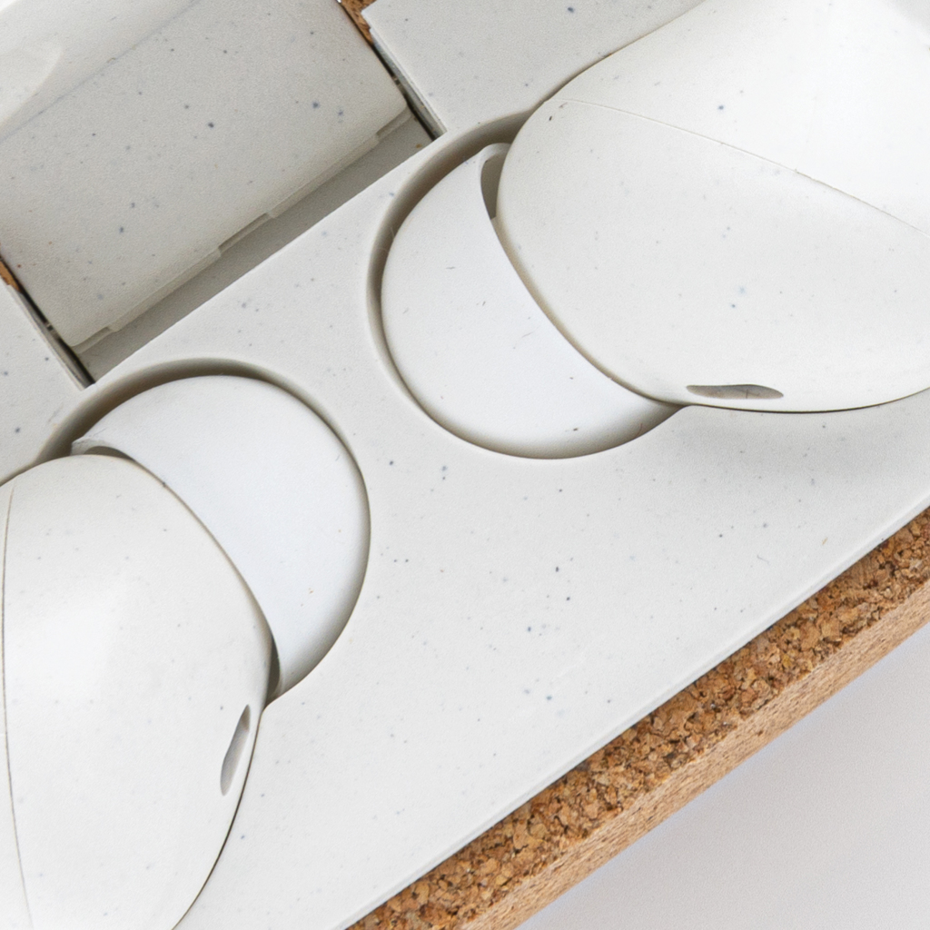 - Elegant design wireless earbuds made with FSC® 100% cork and RCS (Recycled Claim Standard) certified recycled ABS.